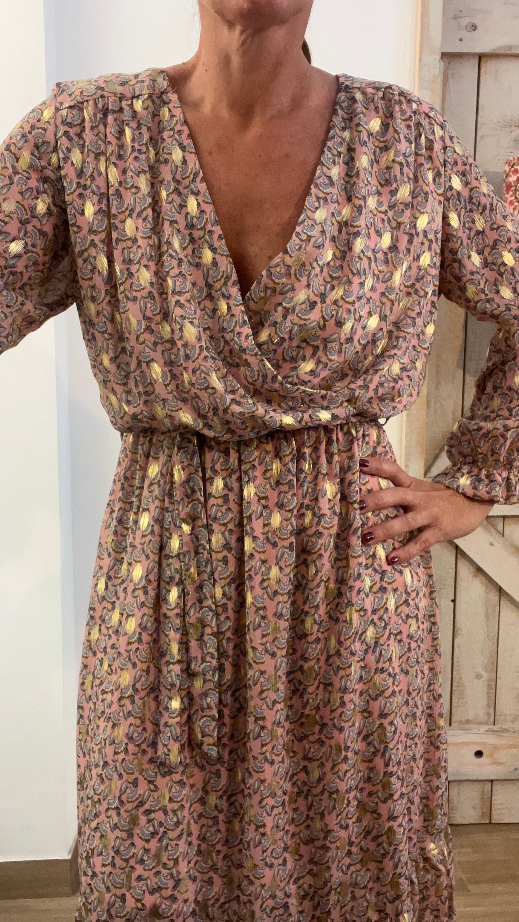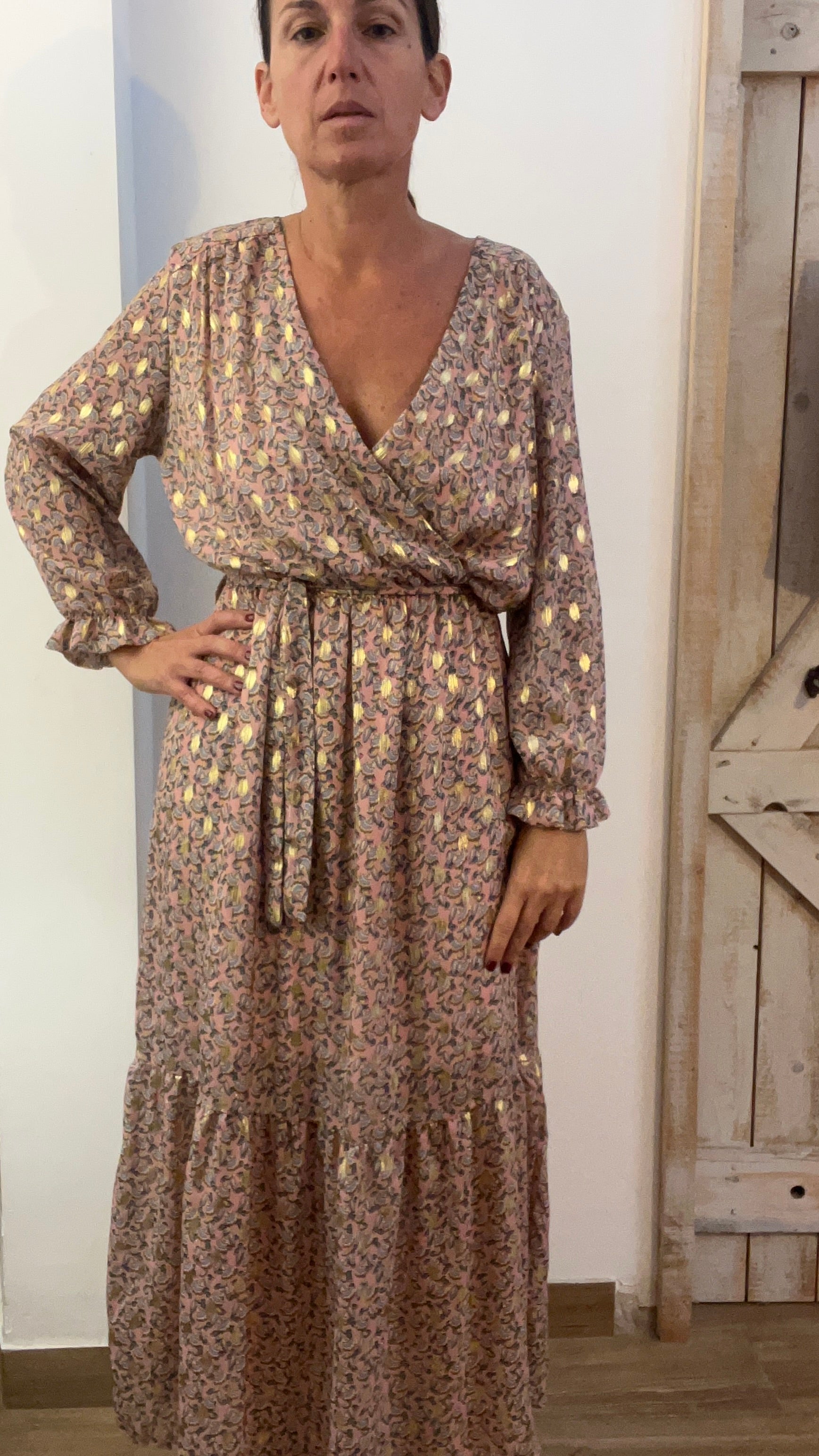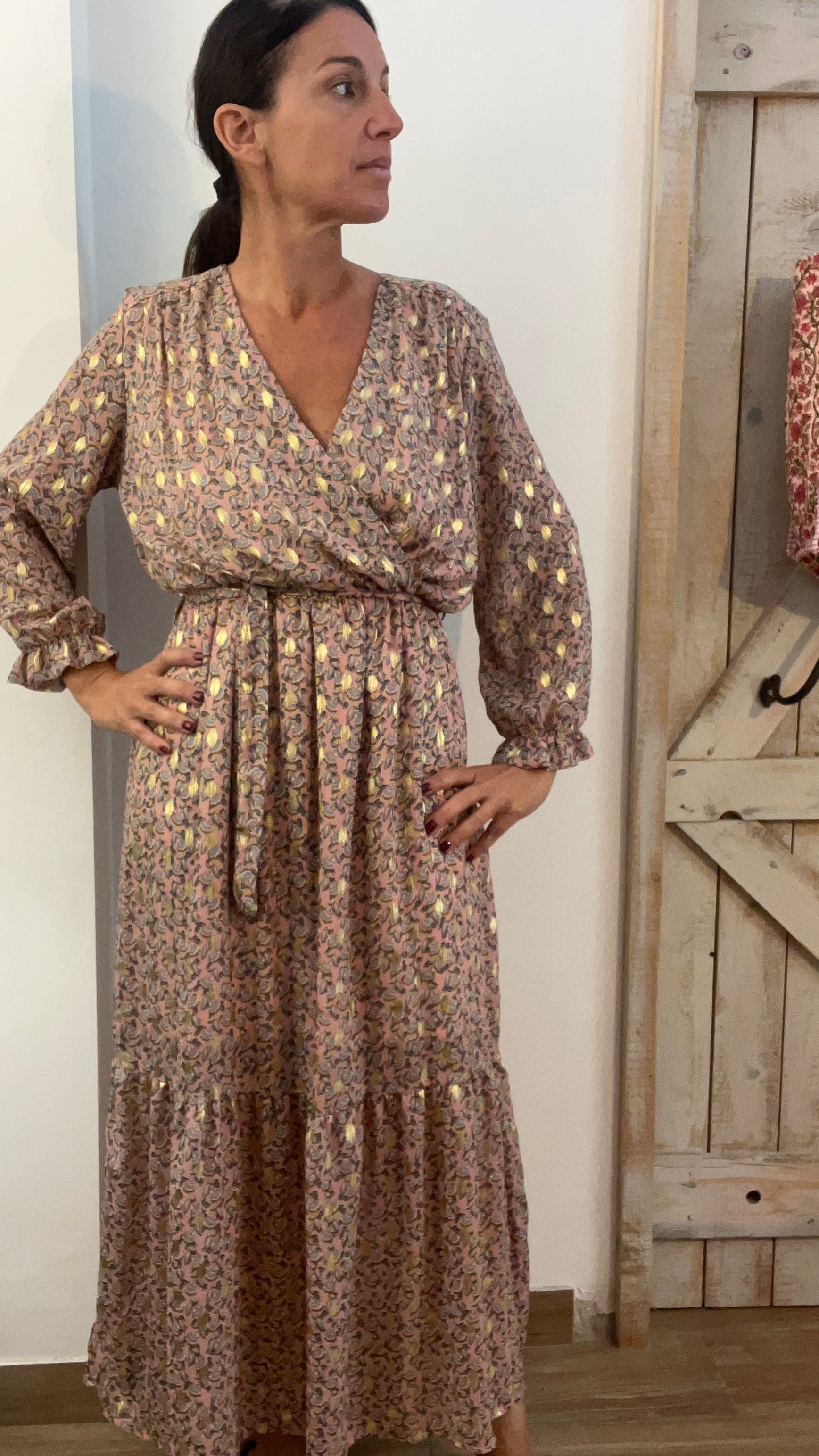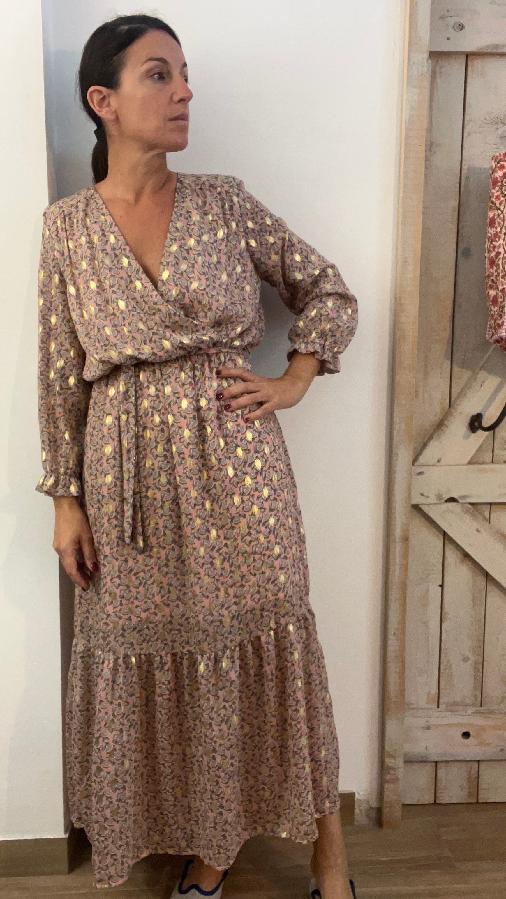 Abito lungo stampato con filo di lurex oro