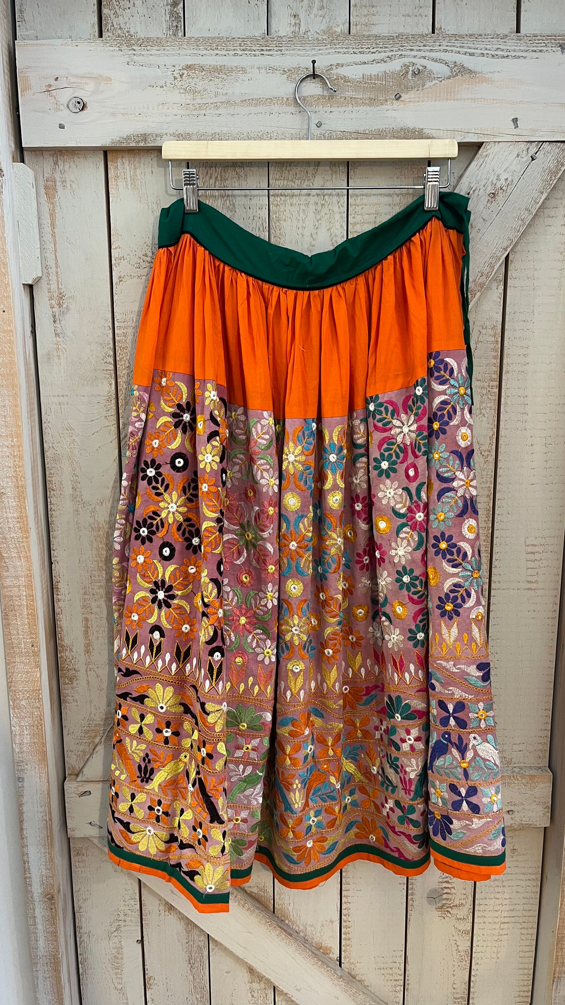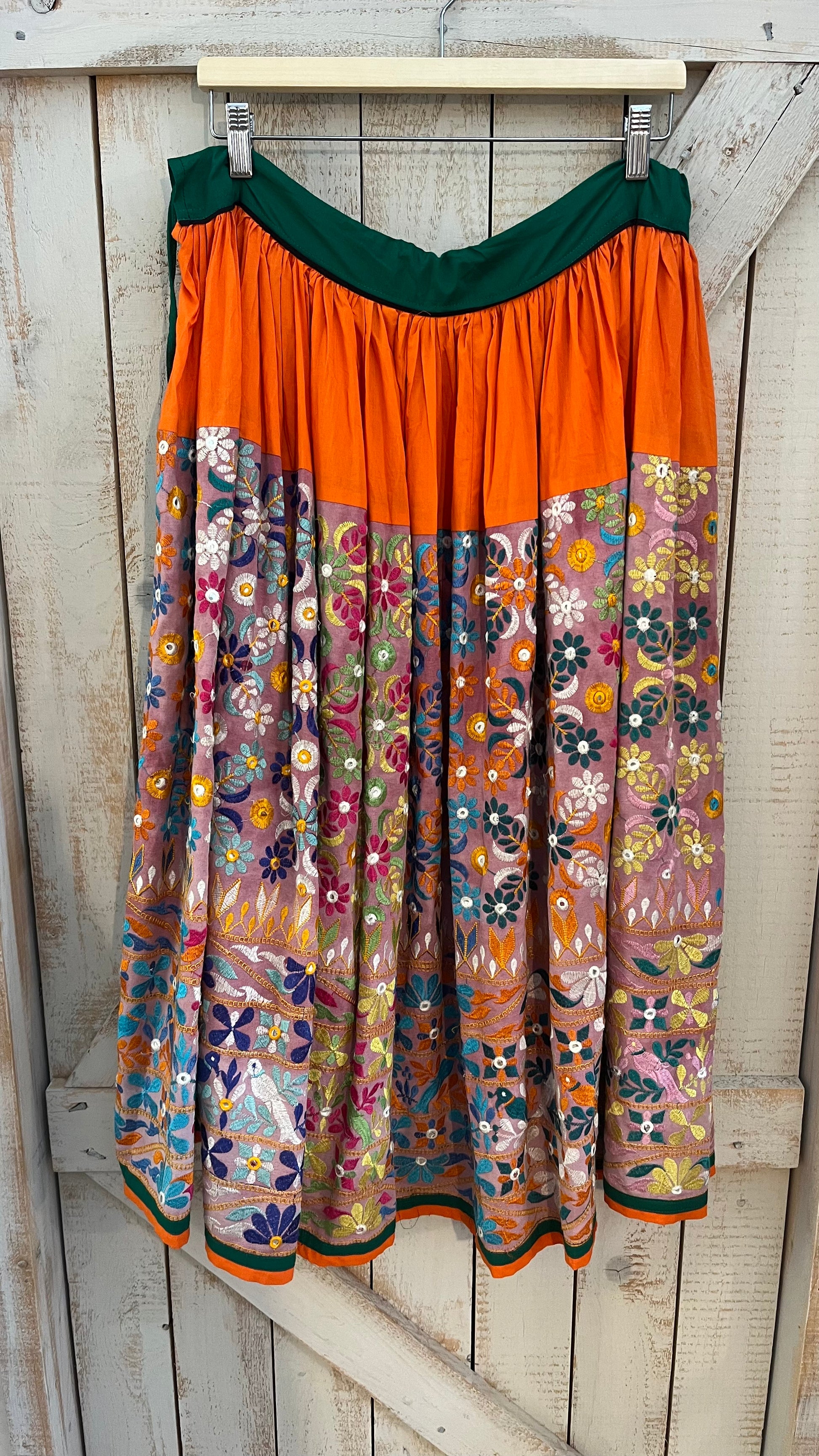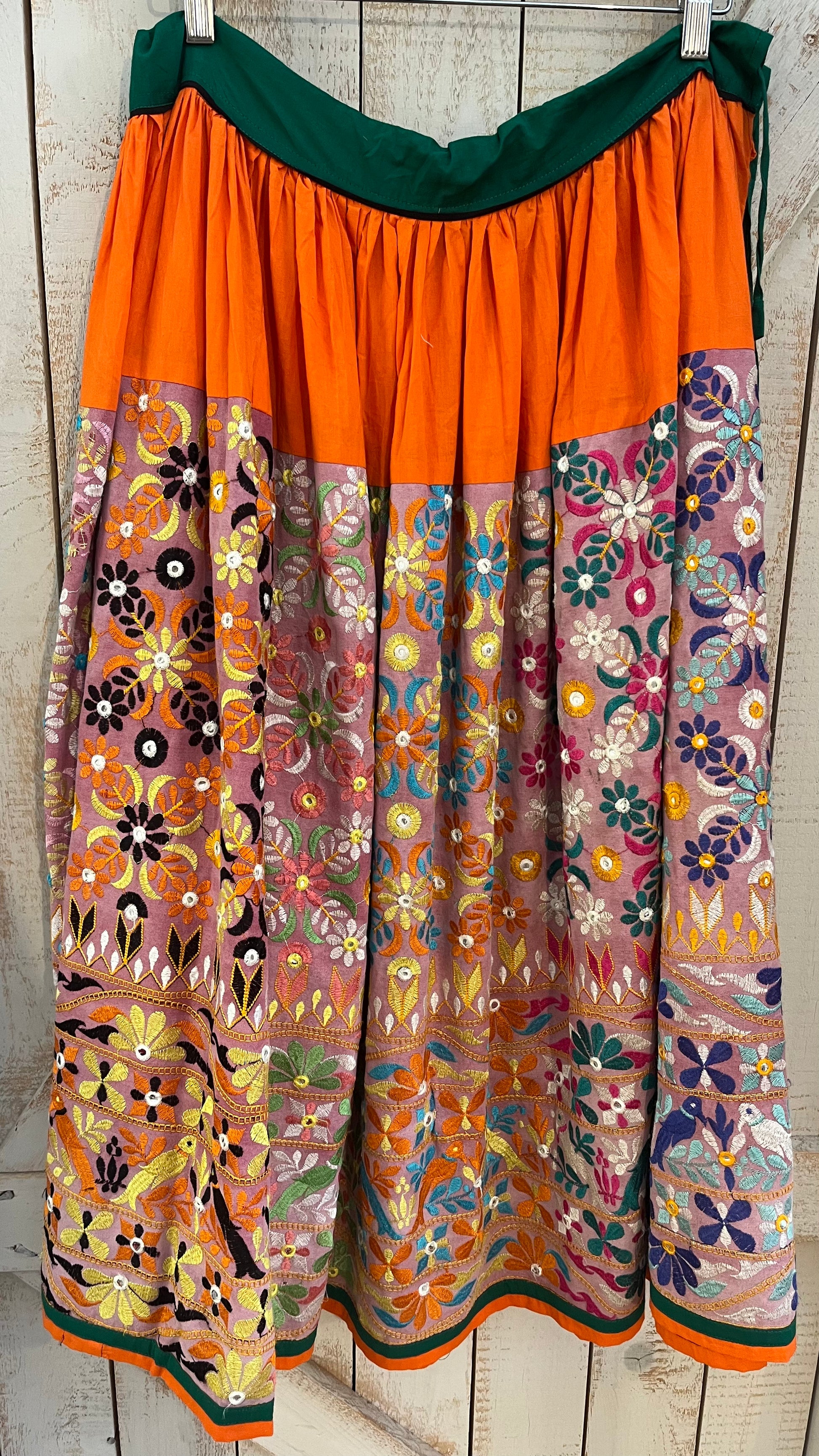 La gonna è realizzata con tessuti di recupero e il ricamo è eseguito a mano, dopo essere stato disegnato sul tessuto con gessi o matite. In alcuni casi si può trovare ancora il disegno sotto al ricamo. Le imperfezioni nel ricamo sono da ritenersi caratteristica importante di questa lavorazione artigianale unica